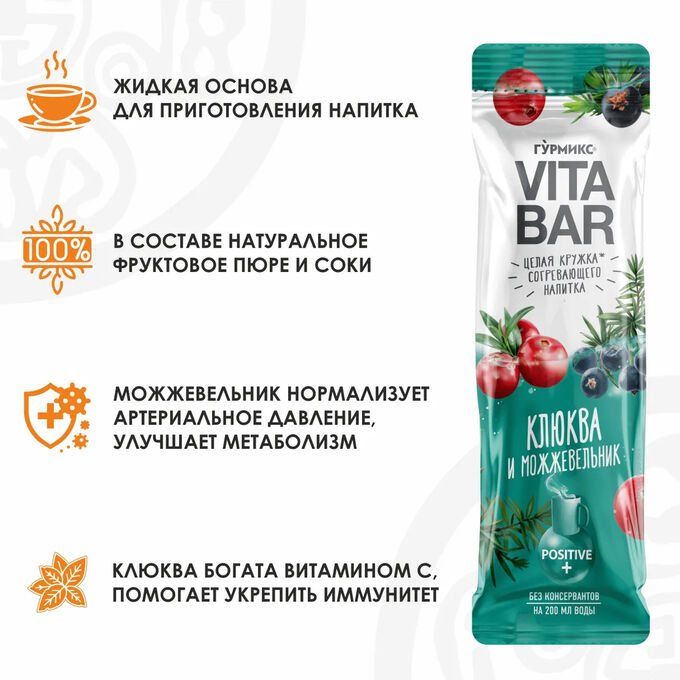 Главная/КОНСЕРВЫ /Гурмикс Стик основа для сог.напитка клюква - можжевельник VITA BAR 33гр 4блХ21шт