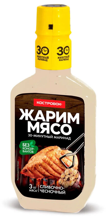 Маринад сливочно-чесночный Костровок Жарим мясо, 300 г.Состав: вода питьевая, масло подсолнечное рафинированное дезодорированное, соль, уксус спиртовой, чеснок, глюкоза, загустители (Е1422, ксантановая камедь, Е1450), сливки, перец чёрный, укроп, яичный желток, дрожжевой экстракт, экстракт чёрного перца, мальтодекстрин, антиокислители (лимонная кислота, Е319, Е385), ароматизаторы.На предприятии используются арахис, горчица, кунжут, моллюски, орехи, ракообразные, рыба, сельдерей, соя, злаки, содержащие глютен, и продукты их переработки.