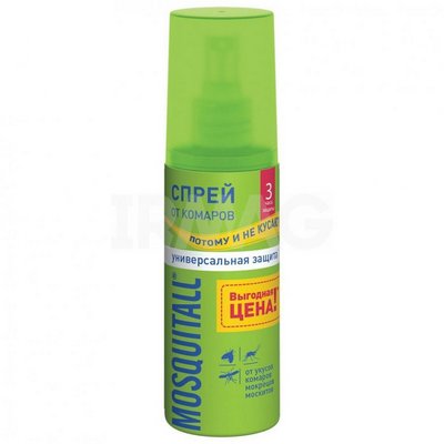 Спрей Mosquitall "Универсальная защита" предназначен для нанесения на открытые участки тела и одежду. Он эффективно защищает от укусов комаров, мокрецов, москитов. Благодаря удобному распылителю, спрей быстро и легко наносится и отпугивает комаров и других кровососущих насекомых. Время действия - до 3 часов. Средство подходит для всей семьи, разрешено к применению детям от 5 лет. Срок хранения: 1 825 суток. Условия хранения: Температура хранения 18-21°С Сухое, проветриваемое помещение, влажность 20-60% Исключить попадание прямого солнечного света.
