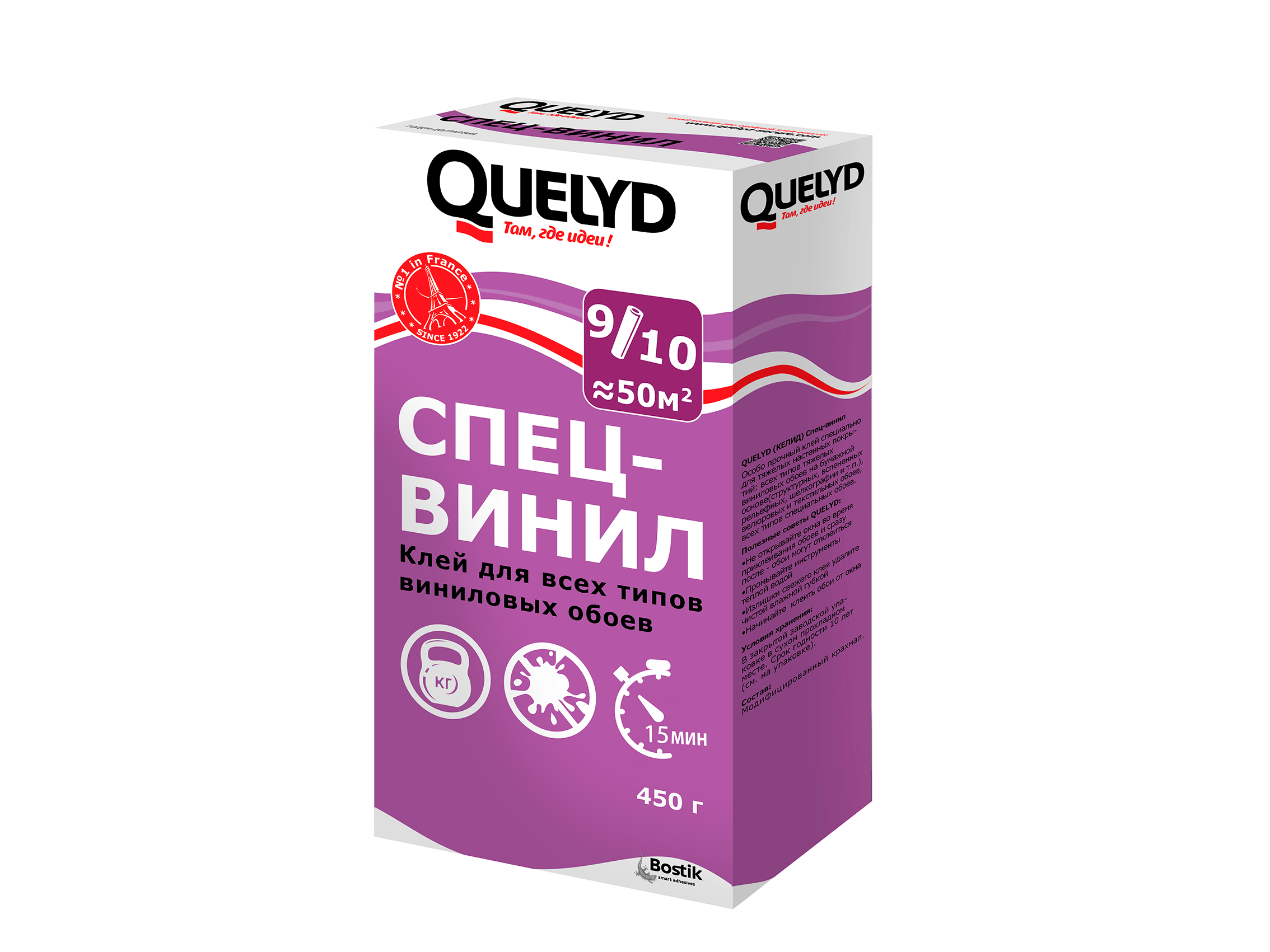 Quelyd Спец-Винил (Келид Спец-Винил) – сухой обойный клей на основе натурального картофельного крахмала с усиленной формулой для всех виниловых обоев на бумажной основе. ОБЛАСТЬ ПРИМЕНЕНИЯ • Приклеивание для всех видов виниловых обоев: структурных, вспененных рельефных обоев, шелкографии, тяжелых обоев, а также: велюровых и текстильных обоев, специальных обоев. Срок хранения: 3 650 суток. Условия хранения: Температура хранения 18-21°С Сухое, проветриваемое помещение, влажность 20-60% Исключить попадание прямого солнечного света.