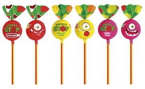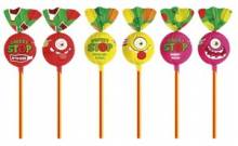 Леденцовая карамель на палочке с жевательной конфетой внутри.