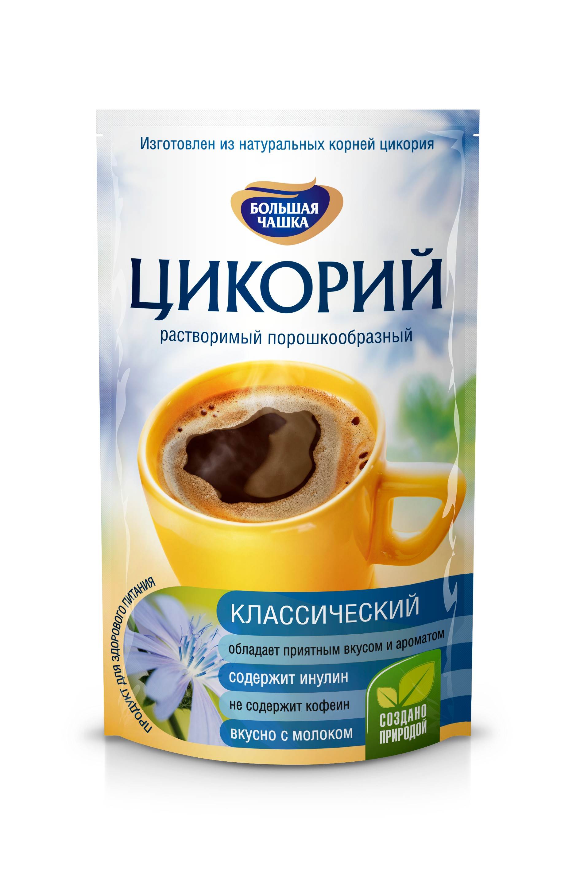 Цикорий натуральный растворимый порошкообразный Большая Чашка - настоящий кладезь полезных элементов, изготовлен из натуральных корней цикория.