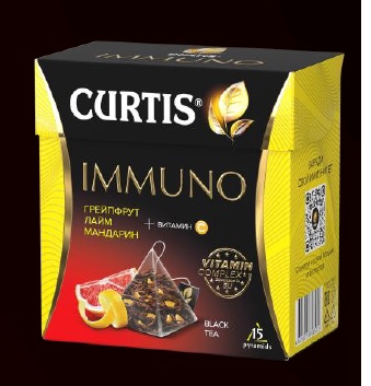 "Чай Curtis ""Immuno"" в пирамидках-чёрный листовой чай, обогащённый витамином С. Цедра апельсина и лимона, сила витамина С способствуют укреплению иммунитета. Насладись изысканным цитрусовым вкусом чая Curtis Immuno. Попробуйте зелёный чай ""Curtis Beauty"" с кусочками винограда, лепестками жасмина и витаминами В6, В9 для естественной красоты.". КЛЮЧЕВЫЕ ПРЕИМУЩЕСТВА Ключевые преимущества продукта: 1. Цейлонский листовой чай с витаминизированным комплексом 2. Витамин C способствует укреплению иммунитета и повышению сопротивляемости организма сезонным испытаниям МАРКЕТИНГОВОЕ ОПИСАНИЕ Маркетинговое описание: Цейлонский черный листовой чай в пирамидках с цедрой апельсина и лимона, обогащённый витамином С. Витамин С способствует повышению сопротивляемости организма сезонным испытаниям. Насладись изысканным цитрусовым вкусом чая Curtis Immuno для укрепления иммунитета. Описание бренда: Curtis - это разнообразие чаев с ярким многогранным вкусом и изысканным ароматом. Мы постоянно создаем для вас новые яркие купажи: фруктово-ягодные, десертные, цветочные. Время за чашкой ароматного чая Curtis пробуждает воображение и вдохновляет реализовывать мечты. Curtis. Выбирай для себя Линейка бренда: Черный чай с ароматными добавками ОПИСАНИЕ ПРОДУКТА Способ применения: Залей кипятком (100°C) 1 пирамидку, заваривай 5 минут. Противопоказания / Меры предосторожности: Индивидуальная непереносимость пищевых ингридиентов входящих в состав продукта Состав продукта: цейлонский чёрный листовой чай, ароматизатор грейпфрут, лайм, мандарин, цедра апельсина, цедра лимона, лепестки подсолнечника и календулы, витамин С Особенности состава: 1. Чёрный цейлонский чай 2. С витамином С 3. Цедра апельсина и лимона в составе Тип упаковки: Картонная пачка Текстура продукта: Чайные листья Форма выпуска: Пирамидка Размер чайного листа: Средний лист Подарочный набор: Нет СВОЙСТВА ПРОДУКТА Энергетическая ценность в (ККАЛ): 3-5 Вкус продукта: Цитрусовый Свойства продукта: Бодрит Сорт продукта: Высший Ароматизированный: Нет Белки в 100 г, г:0 Жиры в 100 г, г: 0 Углеводы в 100 г, г:0 ОПИСАНИЕ УПАКОВКИ Глубина, (мм): 60 Высота, (мм): 106 Ширина, (мм): 101 Материал упаковки: картон Формат упаковки: пачка Фасовка продукта: Коробка ЛОГИСТИЧЕСКИЕ ХАРАКТЕРИСТИКИ Вес брутто, (гр):57 Вес нетто, (гр): 25.5 Срок годности (месяцы):24 Срок годности (дни): 720 Количество коробов в одном слое паллета: 12 Количество коробов на паллете 1.2м: 132 Вложимость коробки: 12 EAN/UPC штрих-код короба: 14620015858538 Длина короба, (мм): 373 Ширина короба, (мм): 208 Высота короба, (мм): 116 Вес брутто короба, (кг):0.744 Вес нетто короба, (кг): 0.306 Условия хранения продуктов: Хранить в сухом месте, в плотно закрытой упаковке. Срок хранения: 720 суток. Условия хранения: Температура хранения 18-21°С Сухое, проветриваемое помещение, влажность 20-60% Исключить попадание прямого солнечного света.
