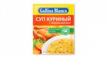 "В России куриный суп — один из самых популярных и любимых миллионами людей. Во всех российских семьях есть свой любимый рецепт куриного супа. Gallina Blanca представляет традиционный рецепт Куриного супа с вермишелью. Продукт без добавления глутамата натрия, ГМО, искусственных красителей и консервантов." Состав: Макаронные изделия - вермишель (мука пшеничная, вода); соль; кукурузный крахмал; овощи (морковь, лук жареный, лук сушеный, чеснок); мальтодекстрин; экстракты дрожжей; масло подсолнечное; растительный жир (пальмовый); травы и специи (петрушка, лавровый лист, куркума); экстракт растительных белков (содержит сою); ароматизатор курицы (содержит яйца, стабилизаторы (гуммиарабик, эфир крахмала и натриевой соли октенилянтарной кислоты), эмульгатор (орто-фосфат натрия), регуляторы кислотности (ацетат и диацетат натрия, лимонная кислота), антиокислители (аскорбиновая кислота, альфа-токоферол)); усилитель вкуса и аромата (5' -рибонуклеотиды натрия); мясо куриное; краситель (рибофлавин). Продукт может содержать следы сельдерея, молока и рыбы. Срок хранения: 450 суток. Условия хранения: Температура хранения 18-21°С Сухое, проветриваемое помещение, влажность 20-60% Исключить попадание прямого солнечного света.