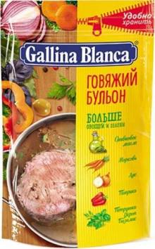 "Gallina Blanca представляет новое поколение рассыпчатых бульонов: с оливковым маслом, с еще большим количеством овощей и зелени! Инновационная практичная упаковка с устойчивым дном и многоразовой застежкой делает хранение и использование продукта еще более удобным. Используйте Говяжий рассыпчатый бульон Gallina Blanca не только при приготовлении супов, но и для вторых блюд, гарниров и даже пельменей.